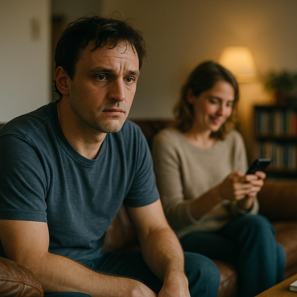 I'm Alex, 32, and tonight should feel special—it's the eve of our five-year anniversary with Emma. Instead, I'm sitting on our worn leather couch in our Chicago apartment, mindlessly scrolling through Netflix options while Emma's completely absorbed in her phone. We've been doing this dance lately—existing in the same space but somehow miles apart. What catches my attention isn't that she's on her phone (who isn't these days?), but the way she's smiling at it. It's that private little smile, the one that used to be reserved for me. You know that feeling when something's off but you can't quite name it? Like when you walk into a room and immediately sense tension no one's talking about? That's the knot forming in my stomach right now. I glance over, trying to be casual about it. "Find anything good?" I ask, but she barely looks up. Just mumbles "Mmm, no, just catching up with people." But there's something in her voice—a slight pitch change that wasn't there before. I turn back to the TV, but I'm not seeing the screen anymore. All I can think about is who's on the other end of those messages making her smile like that. And why, after five years together, my gut is screaming that something isn't right.